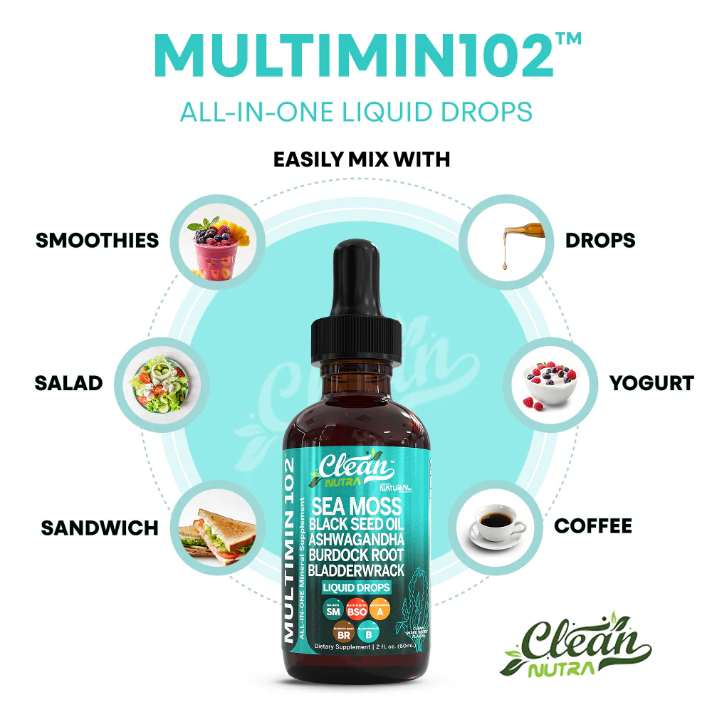 - All-In-One MultiMin102 Organic Sea Moss Liquid Drops: Naturally improve your well-being with Clean Nutraceuticals' Multimin102 drops. Experience the ultimate wellness with our Organic Irish Sea Moss liquid drops, containing a potent blend of sea moss, ashwagandha, bladderwrack, black seed oil, black cumin, and burdock root. This unique blend is formulated to support overall well-being, including immune function, stress resilience, and digestive support.