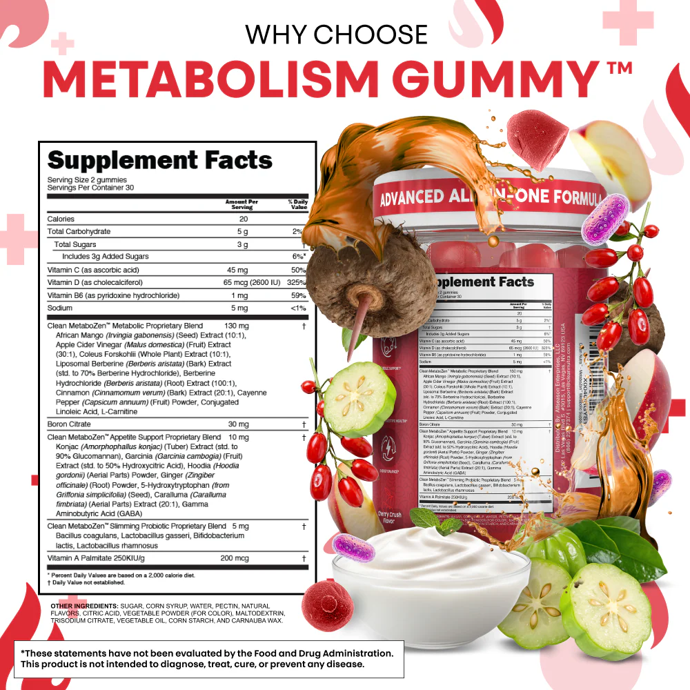 Metabo Zen™ is an advanced all-in-one metabolism support gummy designed to help you feel balanced, energized, and focused throughout your day. This premium plant-based blend combines Apple Cider Vinegar, Berberine, Garcinia Cambogia, and CLA with probiotics, adaptogens, and herbal extracts — crafted to support digestive health, energy, and metabolic balance.